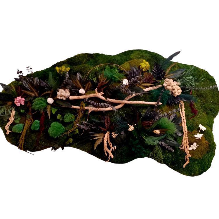 La base est composée d’un tapis luxuriant de mousses et de feuillages, sur lequel se déploient :
