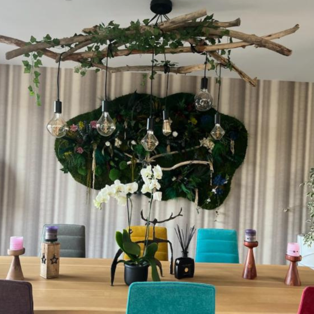 L’ensemble est traversé par un réseau de bois flotté, posé tel un fil de vie, rappelant le lien entre terre, eau et temps — une architecture naturelle qui guide le regard et donne à la pièce toute sa noblesse.