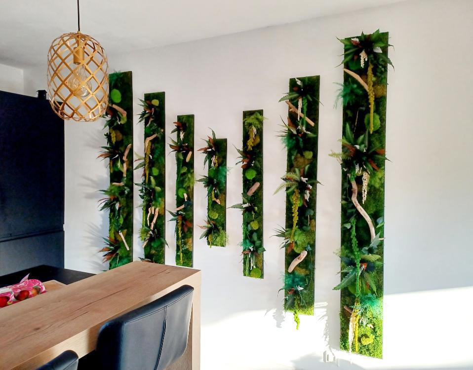 Pour habiller ce grand mur de 3,50 m, nous avons imaginé ensemble une composition en sept panneaux végétaux, jouant sur des hauteurs variées pour créer un subtil effet trompe-l’œil.