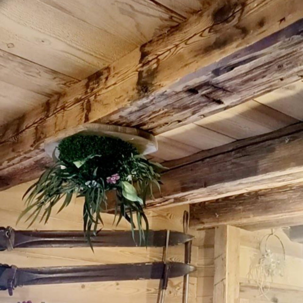 Dans ce restaurant d’alpages “Chez les Steph’s” niché au pied des télésièges de Bernex, l’architecture en bois massif raconte déjà une histoire. Stéphanie souhaitait remplacer ses bouquets de fleurs séchées, arrivés en fin de cycle, par une présence végétale durable, vivante et sans entretien.