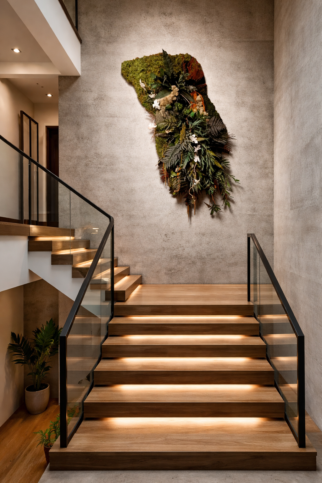 La végétation surgit du mur comme une faille vivante, puis s’élance le long de l’escalier, guidant le regard et le mouvement dans un souffle organique.