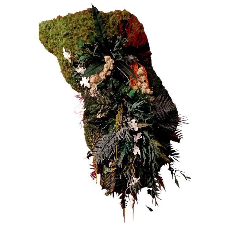 La base de l’œuvre est composée d’un tissage de mousses aux textures variées, travaillées en relief et en nuances de verts, d’ocre et de profondeurs, évoquant une terre ancienne et fertile.
