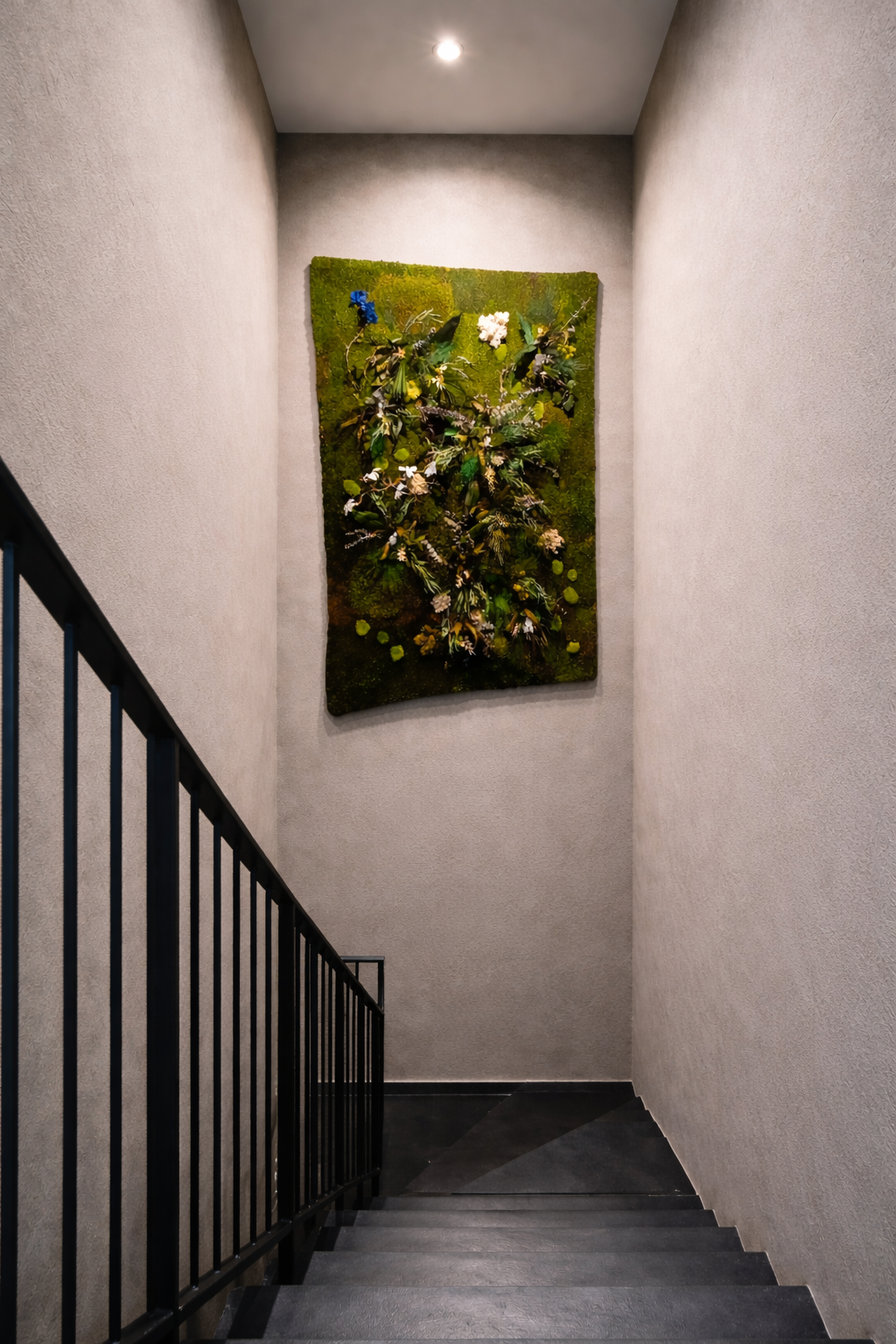 remplir l’espace de l’escalier par le végétal, le transformer en un passage vivant, vibrant, presque sacré.