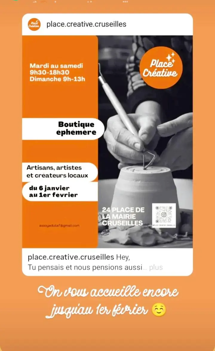 En Décembre, retrouvez moi au Marché de Noël - Place de l'Eglise à Cruseille du samedi 6 à 10h au dimanche 7 à 17h. Après novembre et décembre , la boutique éphémère " PLACE CREATIVE" joue les prolongations jusqu'au 1er février 2026. Où vous pouvez retrouvez mes créations du mardi au samedi de 9h30 à 18h 30 ainsi que le DIMANCHE de9h à 13h...